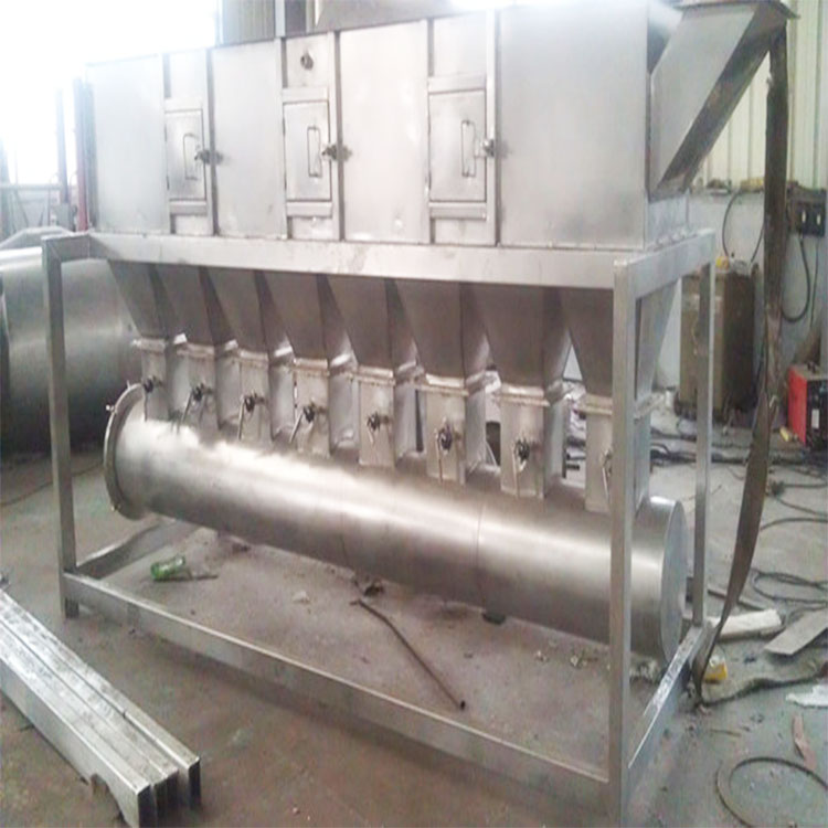 沸騰干燥,又稱流化床,它是由空氣過濾器、加熱器、沸騰床主機(jī)、旋風(fēng)分離器、布袋除塵器、高壓離心風(fēng)機(jī)、操作臺(tái)組成,由于干燥物料的性質(zhì)不同,配套除塵設(shè)備時(shí),可按需要考慮,可同時(shí)選擇旋風(fēng)分離器、布袋除塵器,也可選擇其中一種,一般來說比重大的如沖劑及顆粒物料干燥只需選擇旋風(fēng)分離器,比重輕的小顆粒狀和粉狀物料需配套布袋除塵器,并備有氣力送料裝置及皮帶輸送機(jī)供選擇。