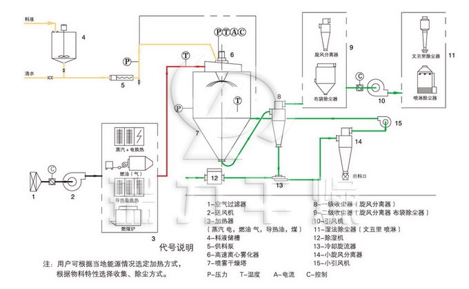 噴霧干燥機為開式循環(huán),并流式,離心式霧化。干燥介質(zhì)空氣經(jīng)過初、中效空氣過濾器過濾后根據(jù)操作指令由鼓風(fēng)機吸取再經(jīng)加熱器加熱通過過濾器的熱風(fēng)分配器進入噴霧干燥主塔。液體物料根據(jù)操作指令經(jīng)過蠕動泵,進入旋轉(zhuǎn)的離心噴頭,在離心力作用下被分散成小霧滴。在噴霧干燥主塔內(nèi),小霧滴與熱風(fēng)在充分接觸,沿其特定路徑進行熱交換后被干燥成為產(chǎn)品,然后通過旋風(fēng)分離器實現(xiàn)分離,固體物料被收集,氣體介質(zhì)再經(jīng)過過濾后被排出。整套噴霧系統(tǒng)易清潔、無死角,符合GMP要求。