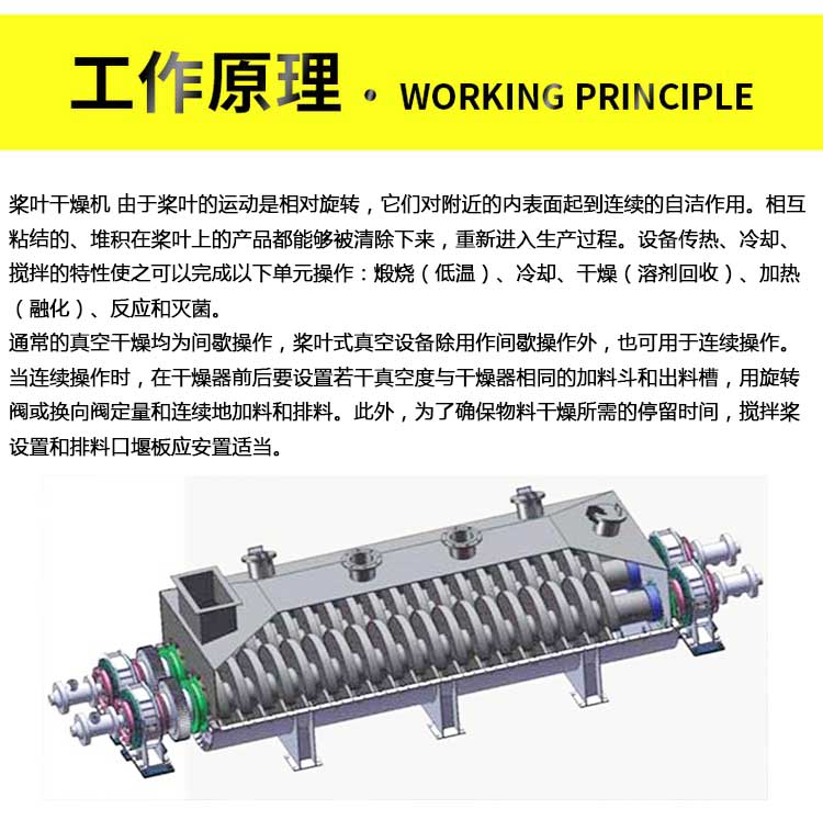 產(chǎn)品描述:空心軸上密集排列著楔型中空漿葉,熱介質(zhì)經(jīng)空心軸流經(jīng)漿葉。單位有效容積內(nèi)傳熱面積很大,熱介質(zhì)溫度從-40℃到320℃,可以是水蒸汽,也可以是液體型:如熱水、導(dǎo)熱油等。間接傳導(dǎo)加熱,沒有攜帶空氣帶走熱量,熱量均用來加熱物料。